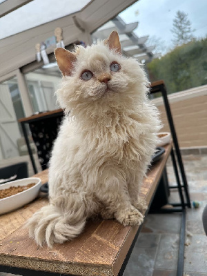 - à la Noisette des Démons du Midi, femelle homozygote rex, cinnamon tortie point et blanc (2e et 3e photos)